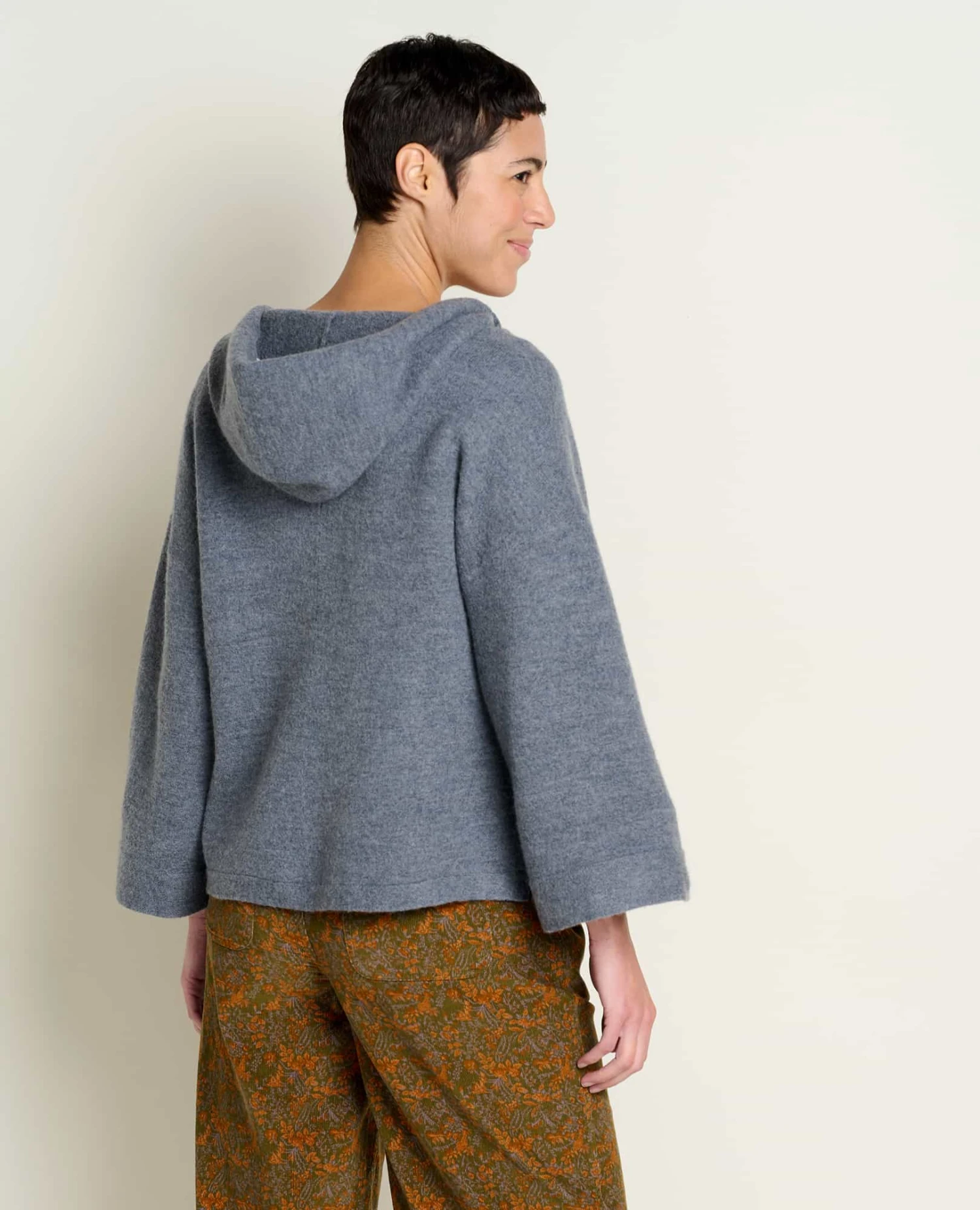 Fit: Boxy fit, hood, v-neck, drop-shoulder, with drop-tail, 23.5″ length