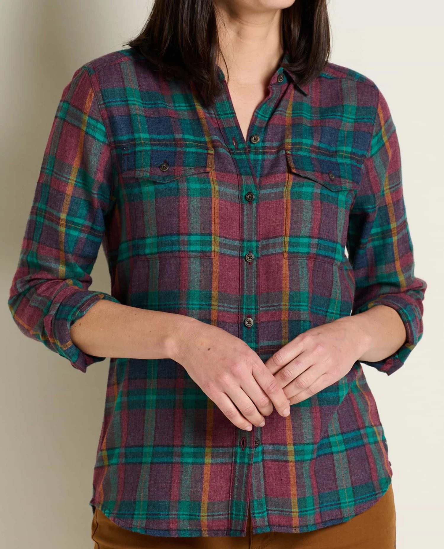 A flannel shirt fit for an outdoor queen. Ours is a lightweight herringbone weave available in epic color combos made better by recycled polyester.